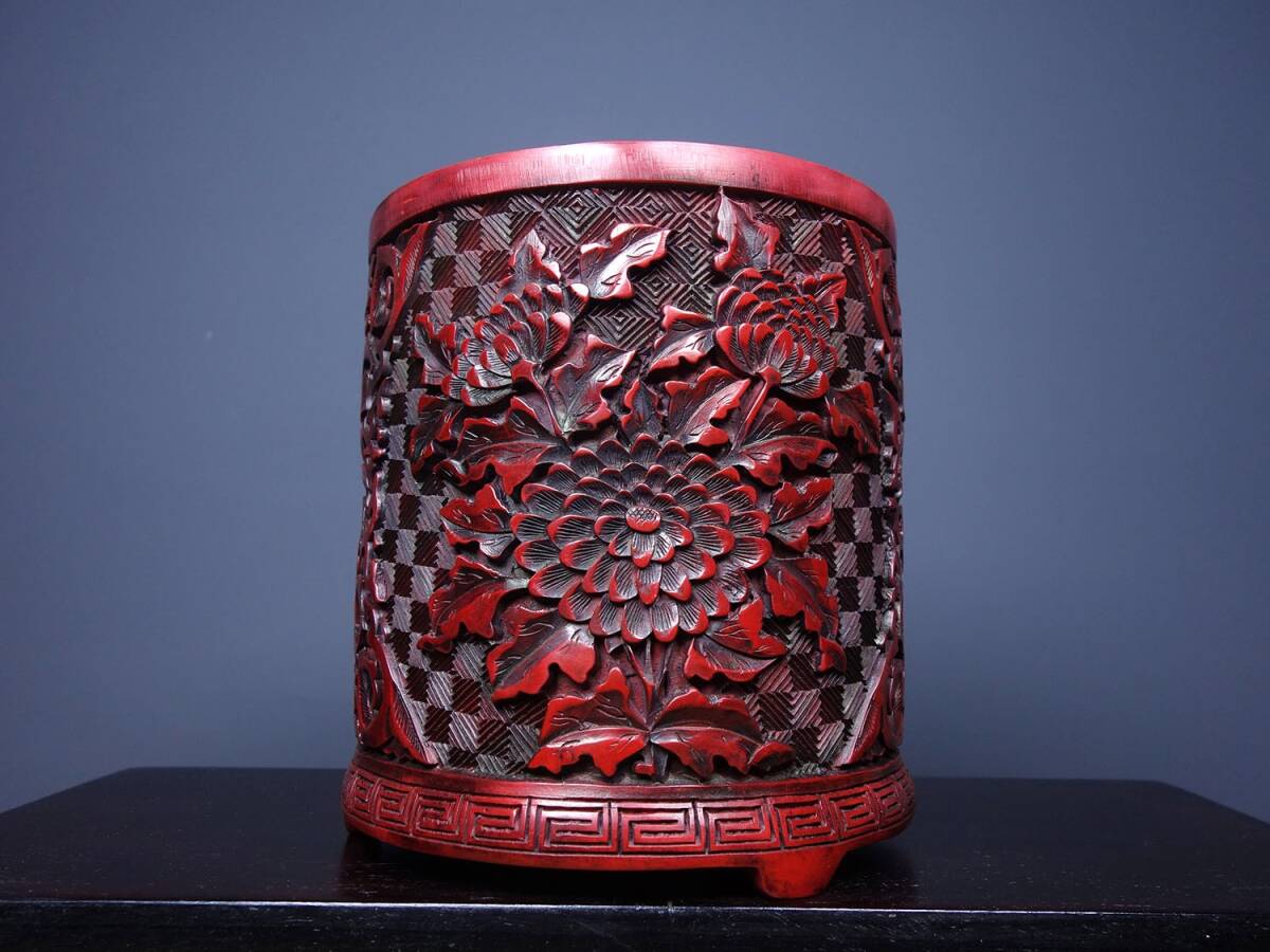 - 『館蔵珍品 漆器漆彫 剔紅 花卉紋 筆筒 文房具 書道品』稀少珍蔵品 古賞物 貴重物品 収蔵品 中国古美術 時代物 古董品