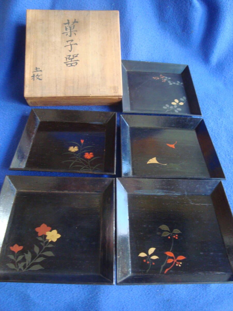 - 「絵変り 銘々皿菓子皿 5客組 桐箱 入り 約13.5x13.5cm 高さ 約1cm 木製 黒塗 草花萩・紅葉・菊など」