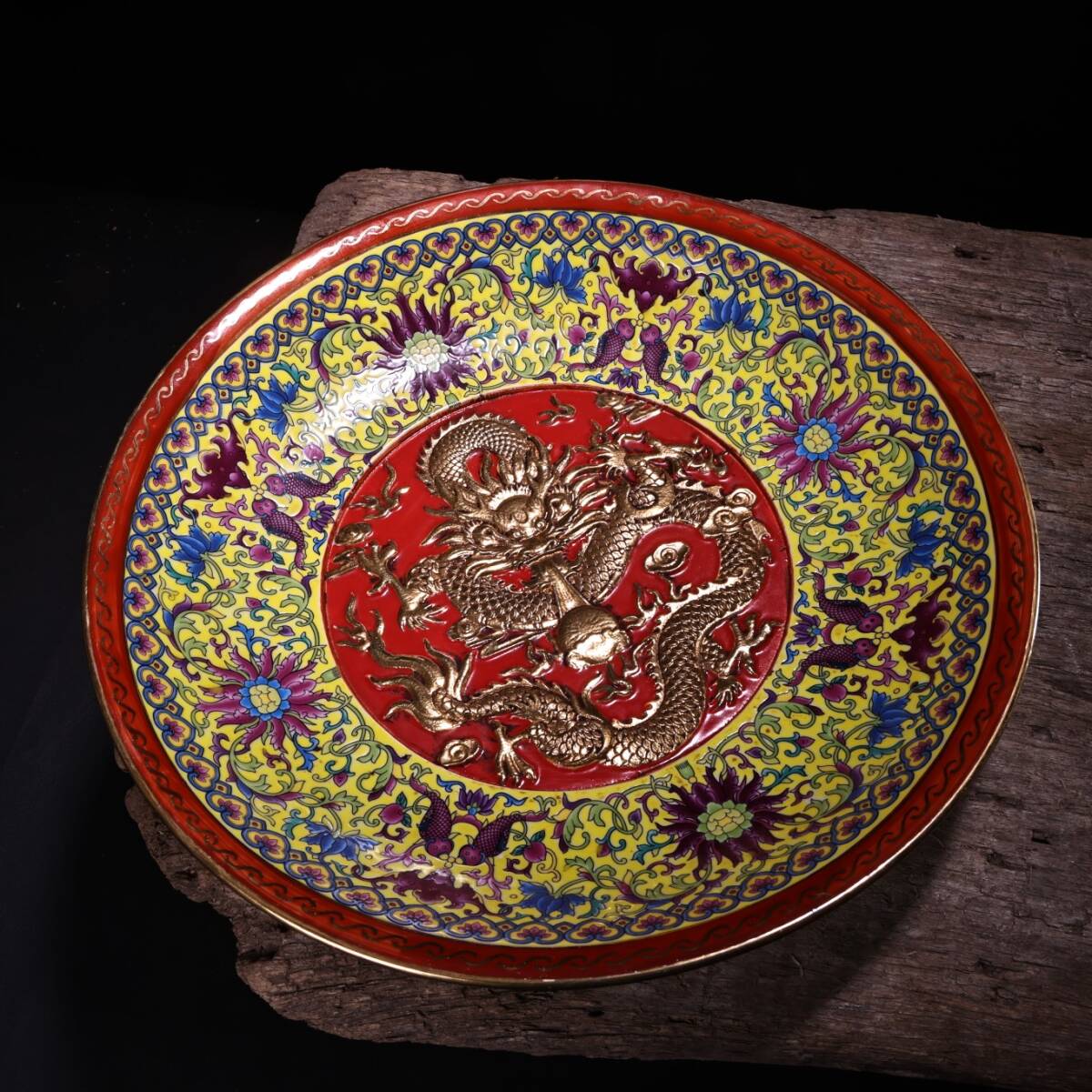 > 多宝閣 ■ 207295 人間国宝 中国磁器【清朝時代の金箔を施した手描きのエナメルドラゴンプレート】工芸品 施釉陶 陶芸 置物 收藏品 孤品