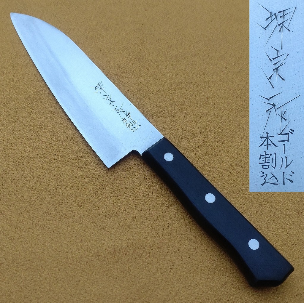 - 万能包丁 堺宗行 ゴールド 本割込 刃長約160㎜ 両刃 洋包丁 三徳包丁 三本鋲 調理器具 刃物 日本製 【4455】【b】