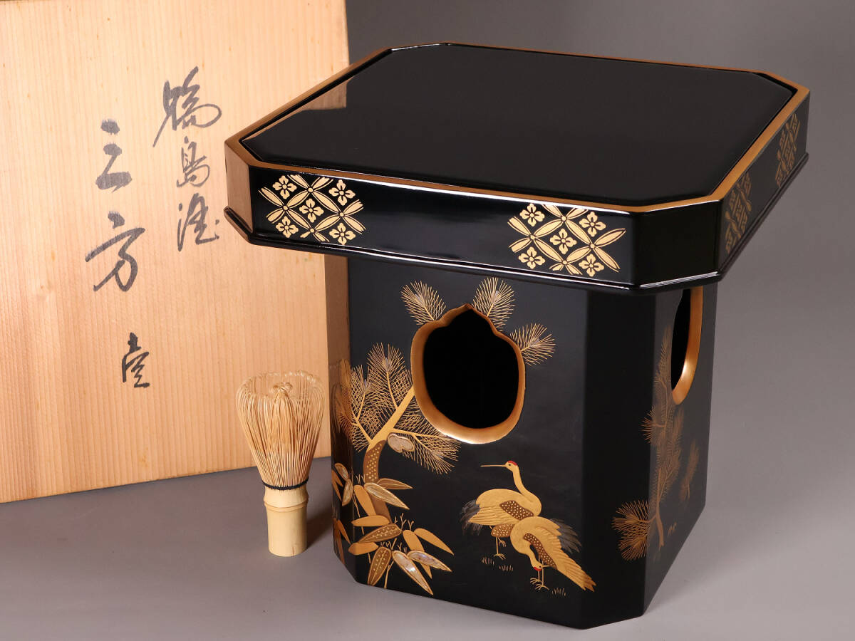 - ② 漆芸 輪島塗 三宝 松竹鶴 花菱 金蒔絵 螺鈿細工 木箱入り 在銘 木製 三宝台 伝統工芸品【MA815】
