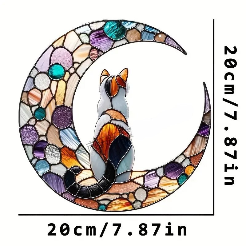- 【猫・月・三毛猫・ステンドグラス風】アクリルプレート 飾り サンキャッチャー チェーン付き オブジェ お洒落 壁や窓辺の飾りに◎