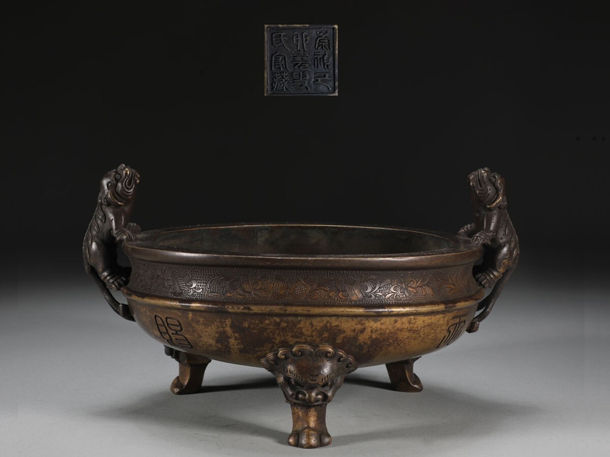 - 「明代 崇禎己卯堯叟氏家藏 古銅彫 三足獣足 猊獣耳老銅香炉」旧銅器 置物擺件 賞物 中国古美術 旧蔵出