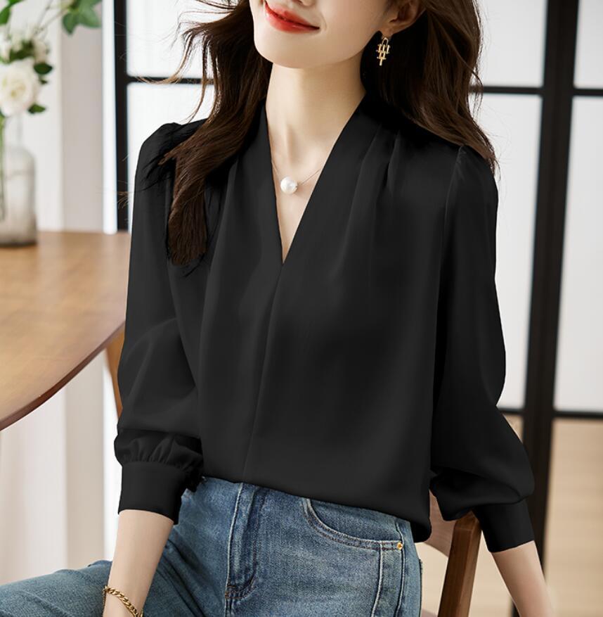 > 人気推薦/エレガント サテン 長袖シャツ レディース Vネック 上品 高級感 春夏秋 オフィス 通勤 ブラウス 着痩せ 涼感 トップス / グレー