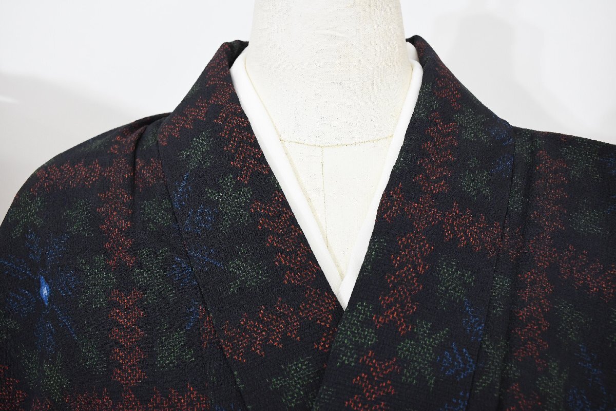 > 紬 着物 単衣 縮緬正絹 格子和更紗 渡来柄 身丈154cm 裄丈63cm ★ kb-6934 桜庭呉服店