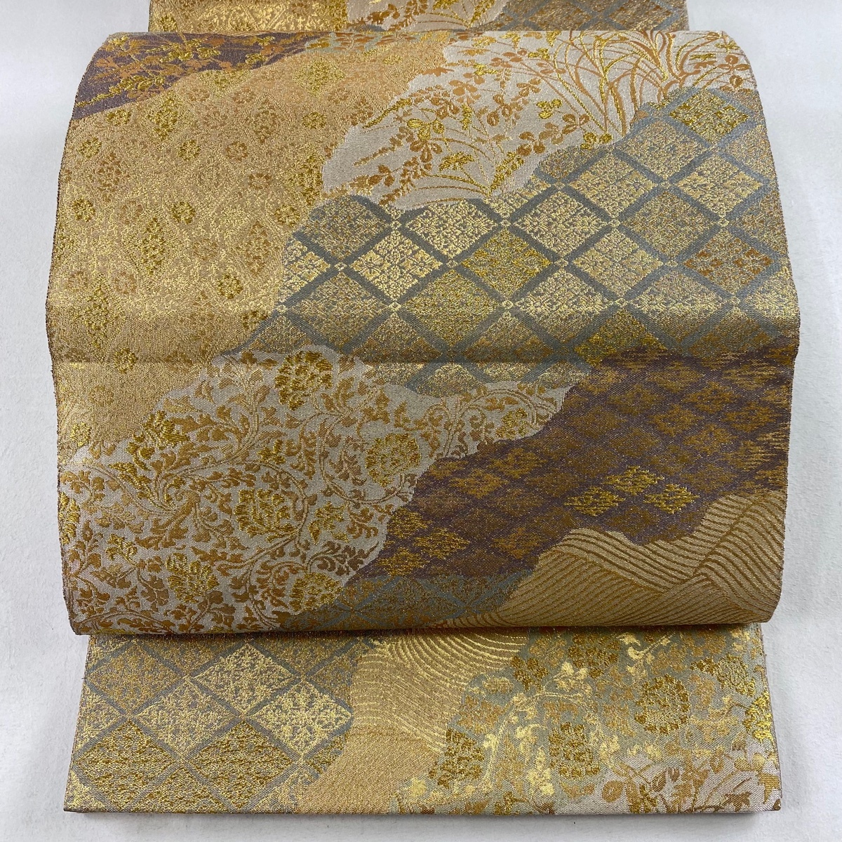 > 袋帯 美品 秀品 草花 波 金糸 箔 金色 六通 正絹 【中古】