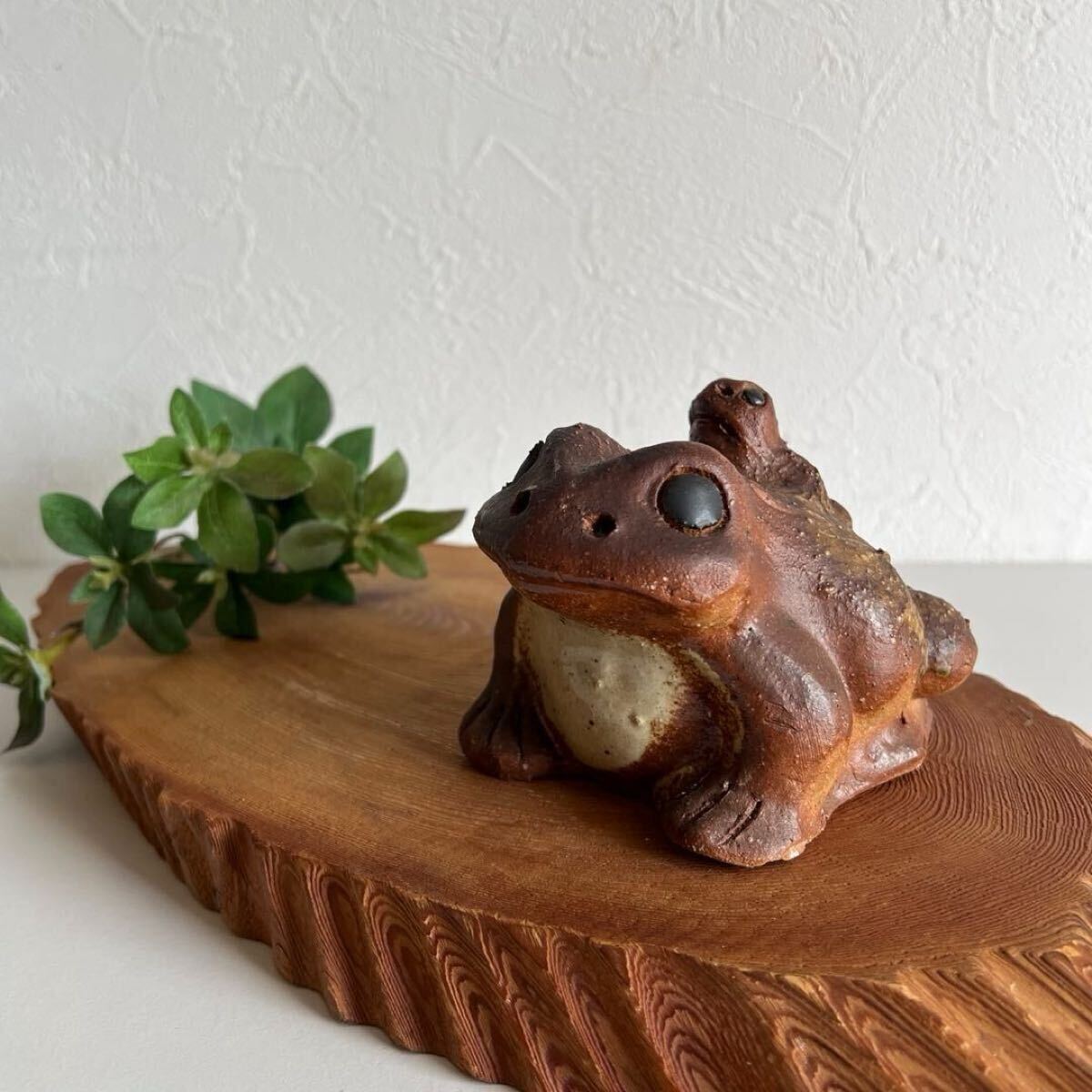 > wasabi k813 縁起物 信楽焼 親子蛙の置物 カエルのオブジェ 和のインテリア ガーデニング やきもの 背中に小さな小かえるを背負った逸品