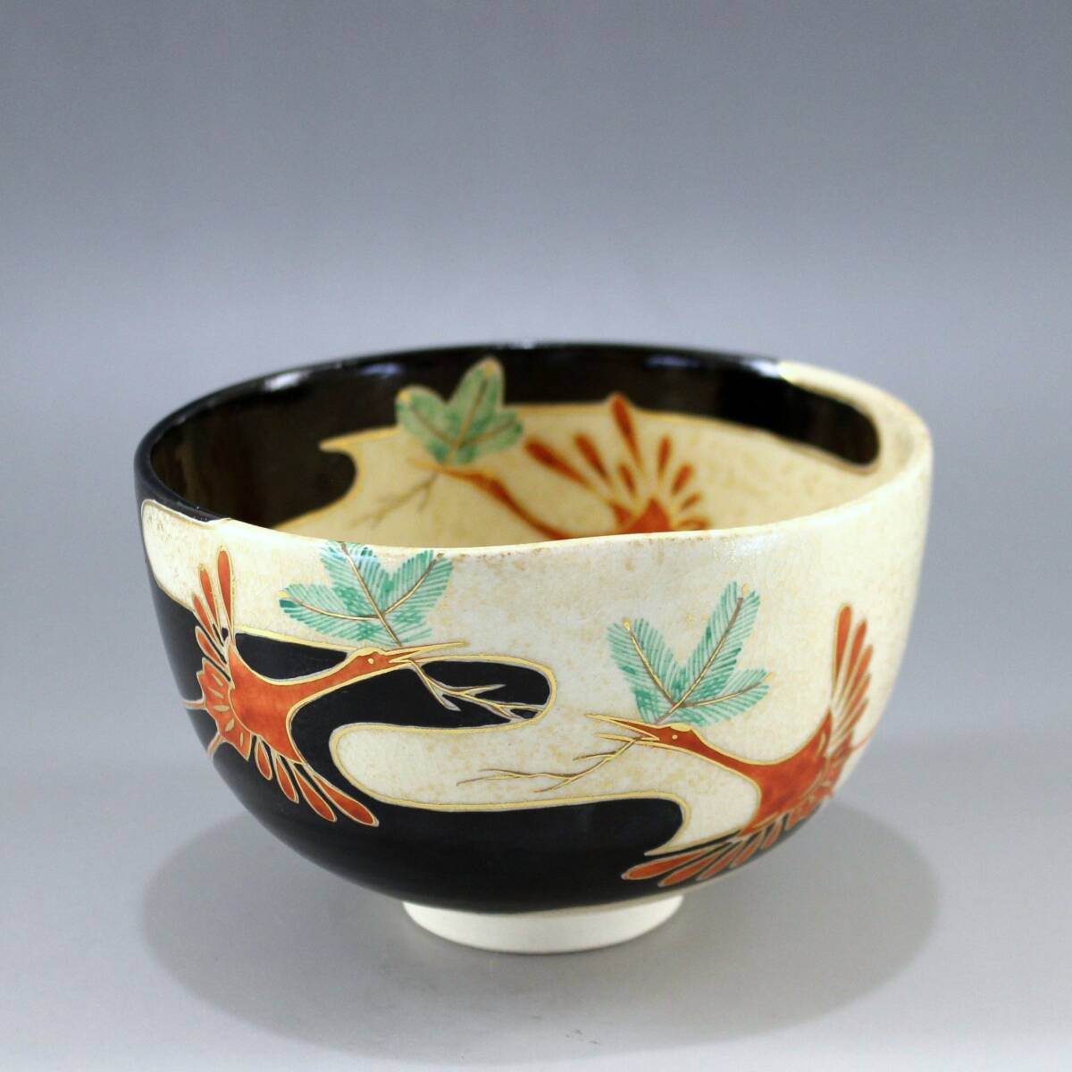- 【永楽即全 十六代 永楽善五郎】 仁清写 金砂子 松喰鶴 茶碗 共箱 仁清黒 千家十職 茶道具