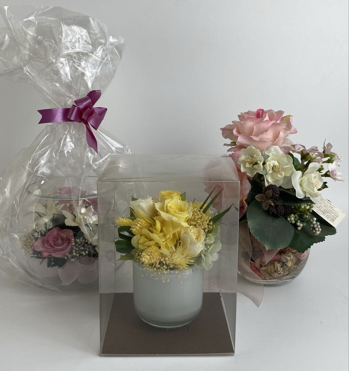 - ★造花★フラワーインテリア 薔薇 イエロー ピンク 他 インテリア 置物 ドライフラワー ガラス鉢 3点まとめ★611★ef648