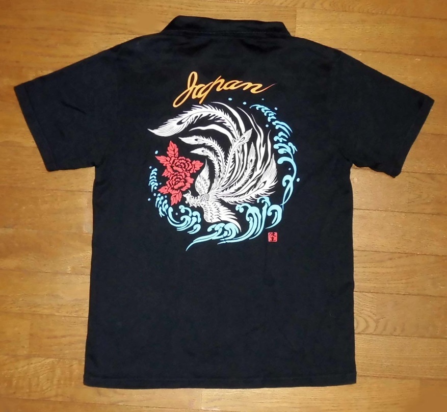 > 波達 波乗達人 スキッパーポロシャツ 半袖 コットン ノーボタン ポロシャツ Vネック 和柄 JAPAN 鳳凰 BLK M 使用僅 美品/サーフィン