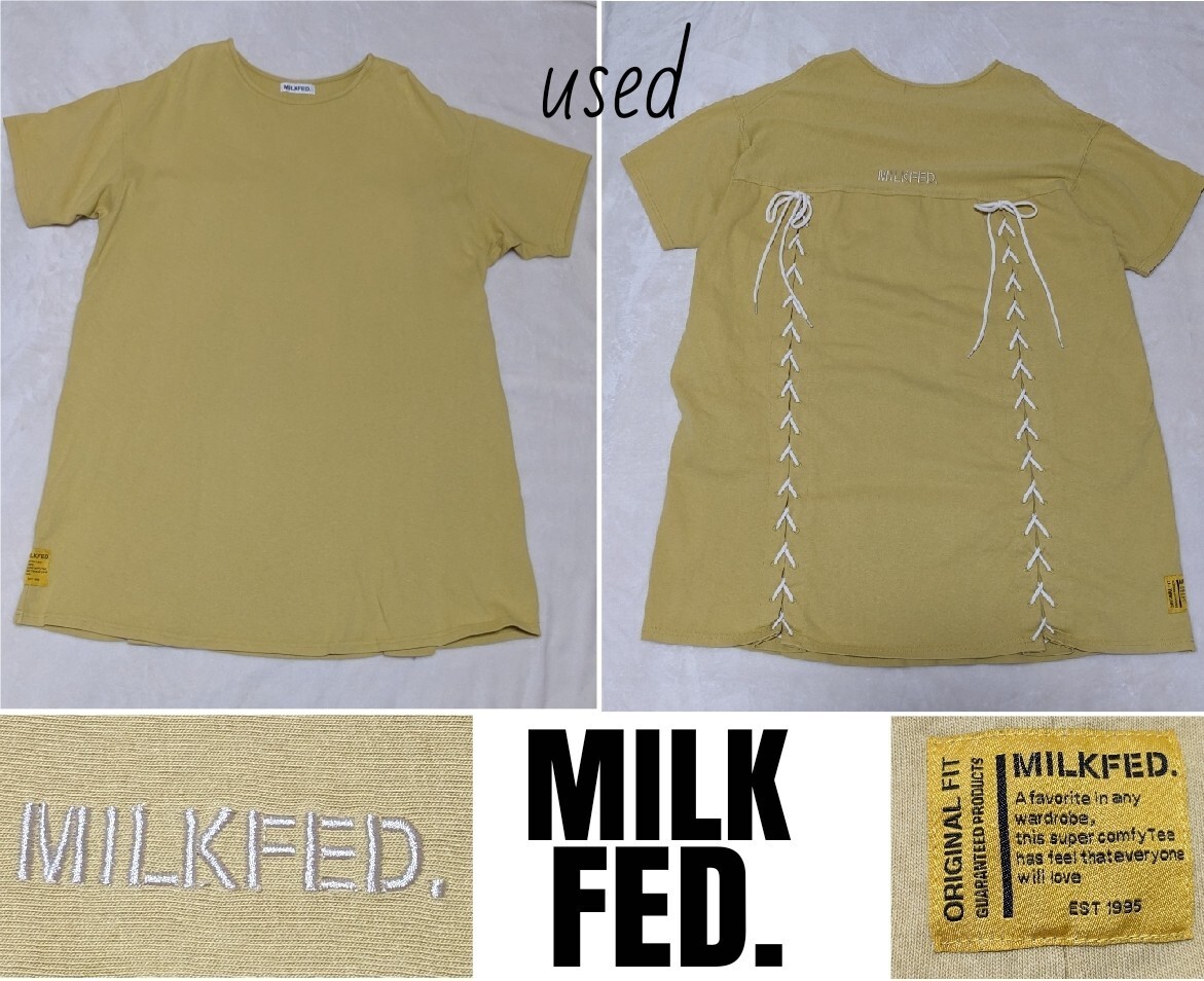 - MILKFED. レースアップワンピース 半袖 フリーサイズ ミルクフェド イエロー カラシ色 Tシャツ トップス大きめサイズ膝丈 重ね着レディース