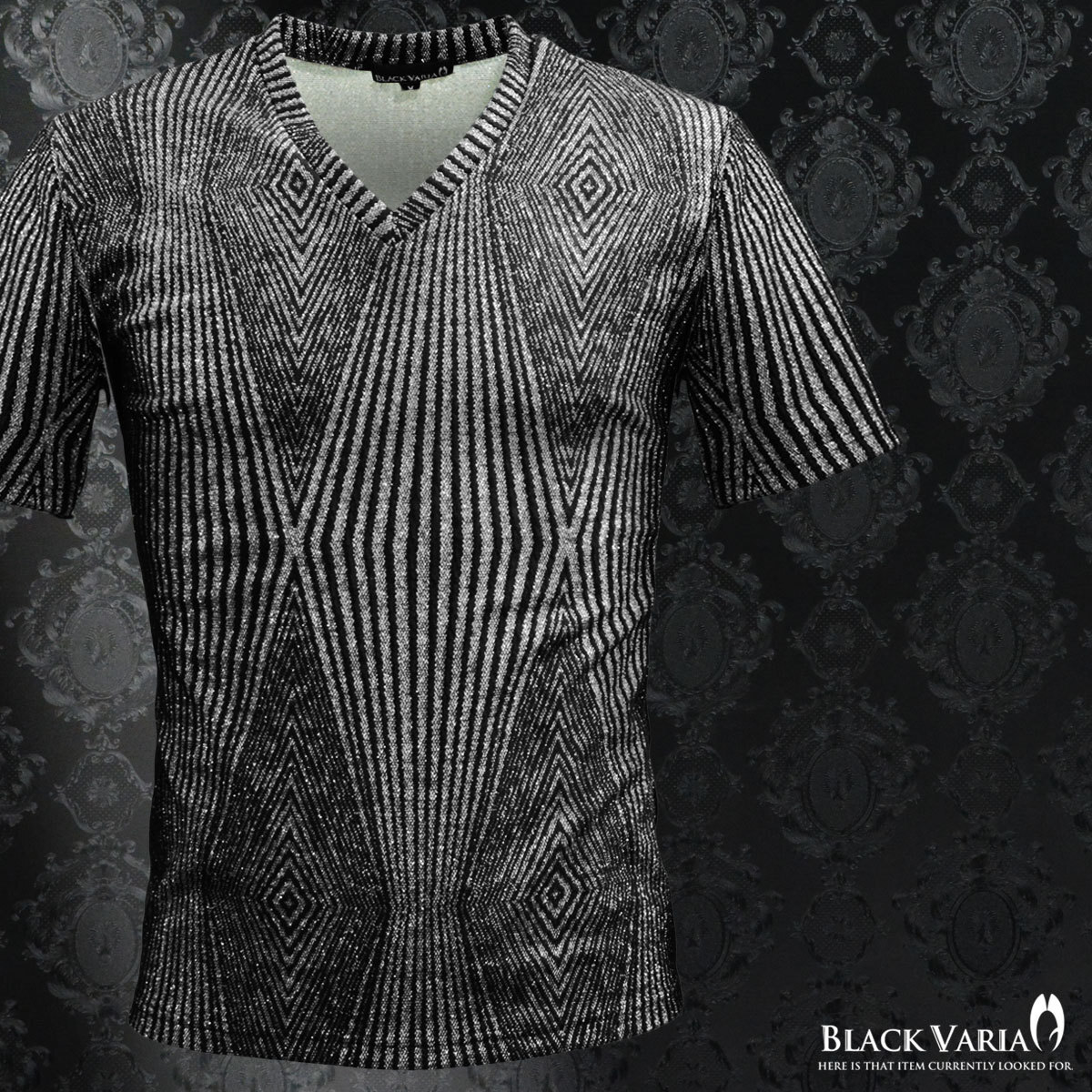 > 9#163912-si BLACK VARIA シャイニー ラメ ダイヤ織柄 ニット 光沢 半袖 Vネック カットソー メンズ(シルバー銀ブラック黒) LL パーティー