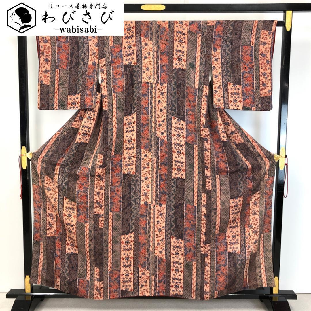 - 小紋 型染 縦縞に寄せ柄 花柄模様 縮緬 灰紫色 K-5150 着物 きもの kimono 和服 和装 中古 リサイクル着物 【送料無料】
