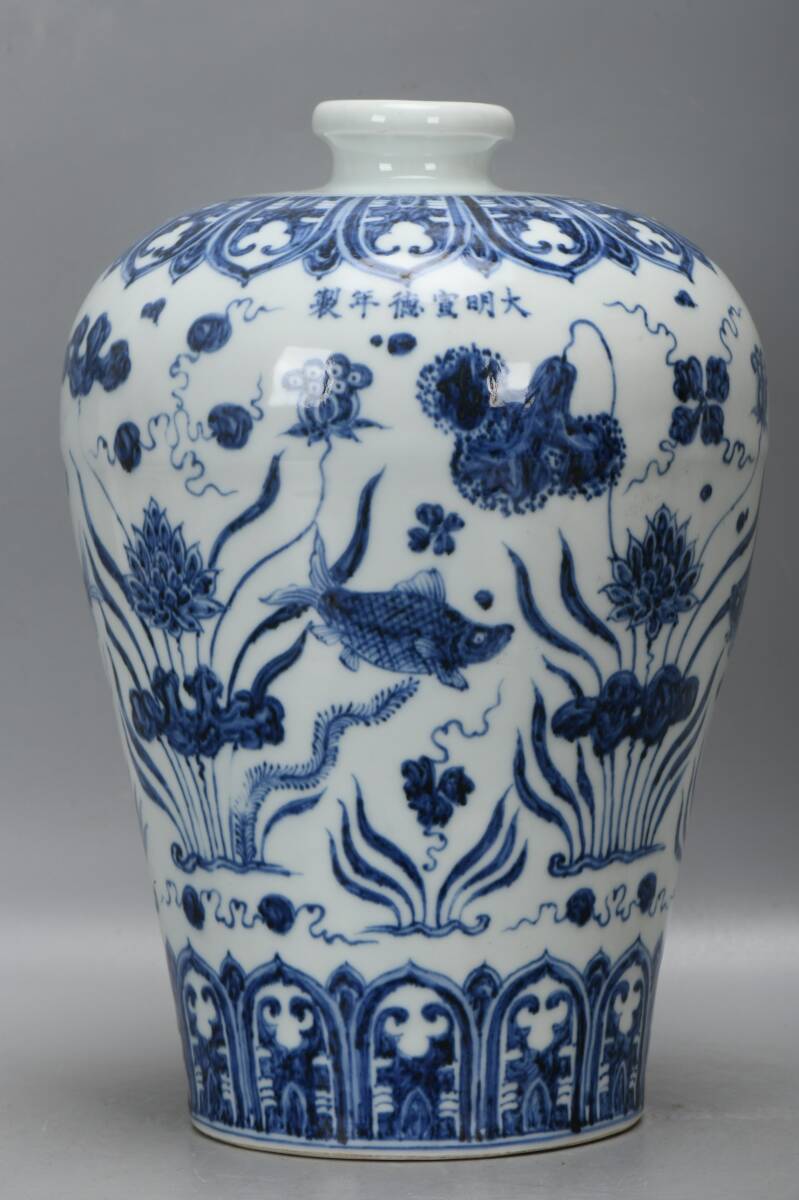 - ◆蔵出◆中国古美術 大明宣徳年製款 青花 纏枝蓮 荷叶魚藻紋梅瓶 美品 細密細工造 置物 擺件 古賞物 骨董 時代物 A04