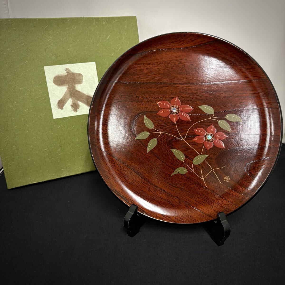 未使用 蒔絵師 辻照二 欅 貝入鉄仙 丸盆 29.5cm 天然木 卓上盆 螺鈿細工 煎茶盆 茶道具 漆器 (08307E
