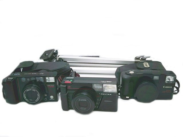 - ★計4点まとめ MINOLTA AF-Tele Canon Autoboy ZOOM105 PENTAX ZOOM70DATE Velbon HE-3 フィルムカメラ 三脚 撮影機材★/H