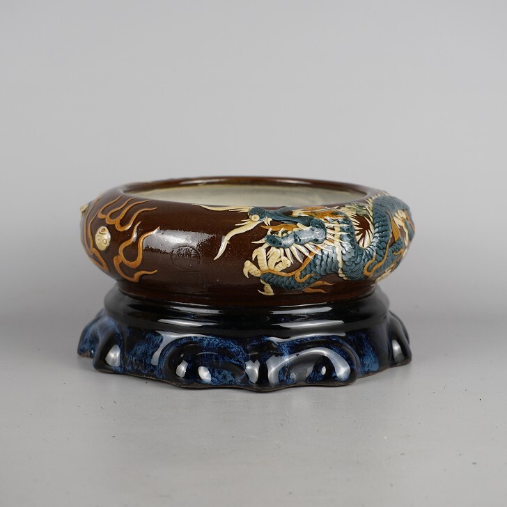 - 【中古】 鉢 水鉢 落款あり 中型 長辺 約20cm 丸型 色絵 龍 りゅう リュウ 鳳凰 水連鉢 水盤 盆栽 花器 水瓶 現品 中古