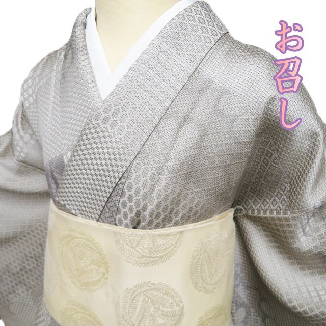 > お召し 着物 中古 正絹 袷 カジュアル 幾何学模様 花模様 砂色 身丈160cm 裄68.5cm M きもの北條 A1265-1