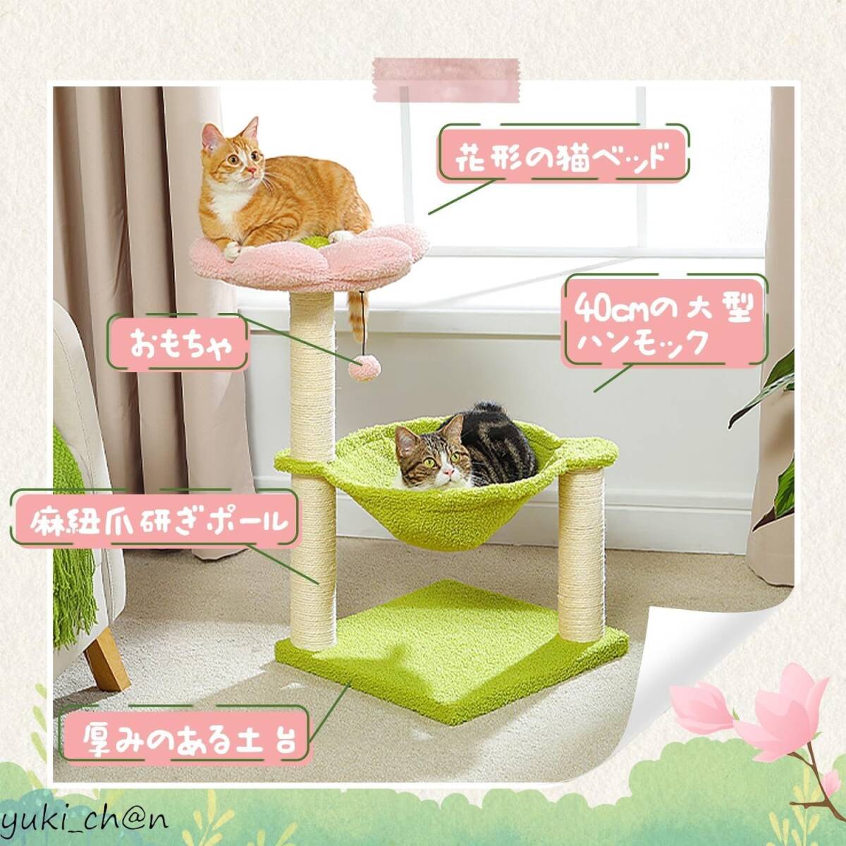 - キャットタワーミニ 猫タワー 据え置き 低い 小型 ハンモック 省スペース 天然サイザル麻 カラフル 組立簡単 ポンポン ピンク 70cm
