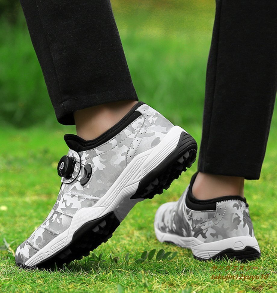 - 新作 ダイヤル式 ゴルフシューズ 迷彩柄 運動靴 メンズ スパイクレス 男女兼用 スポーツシューズ 4E幅広 男女兼用 軽量 撥水 グレー 28.0cm