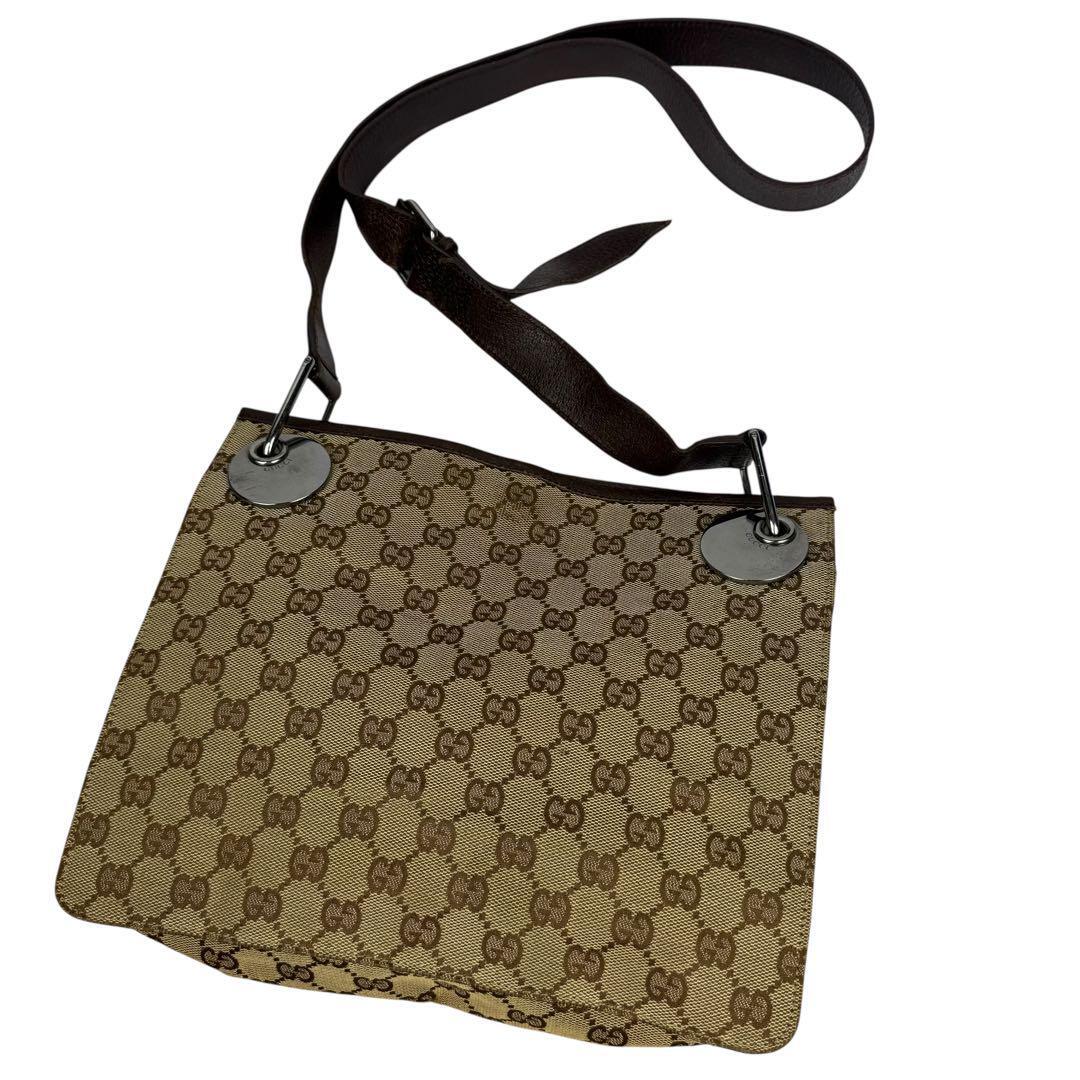 > 【良品】120841 GUCCI グッチ GG柄 キャンバス ショルダーバッグ サコッシュ 斜めがけ ロゴ入り金具 スクエア レザー ベージュ ブラウン