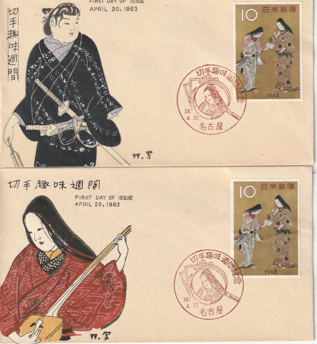 - FDCc 1963年 切手趣味週間 扇―三味線 2種 中村浪静堂
