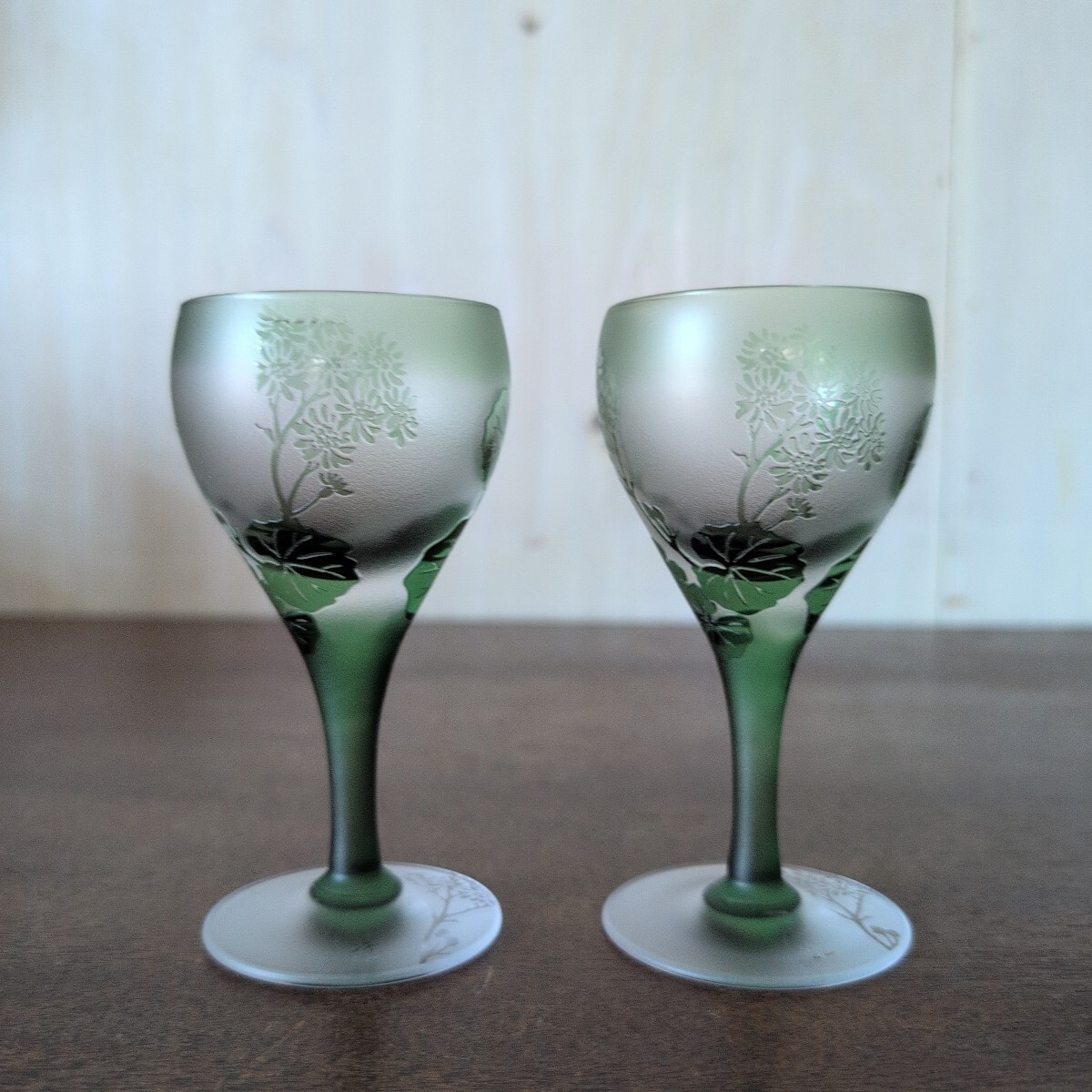 - 食前酒 ペア ガラス グラス 在銘 箱なし 酒器 グリーン 花柄 植物