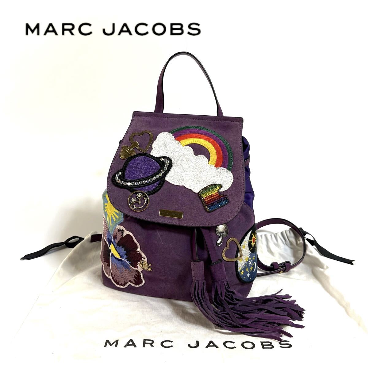 > 【美品】MARC JACOBS マークジェイコブス スエード レザー 刺繍 アップリケ ワッペン バックパック リュック デイパック パープル 元袋付