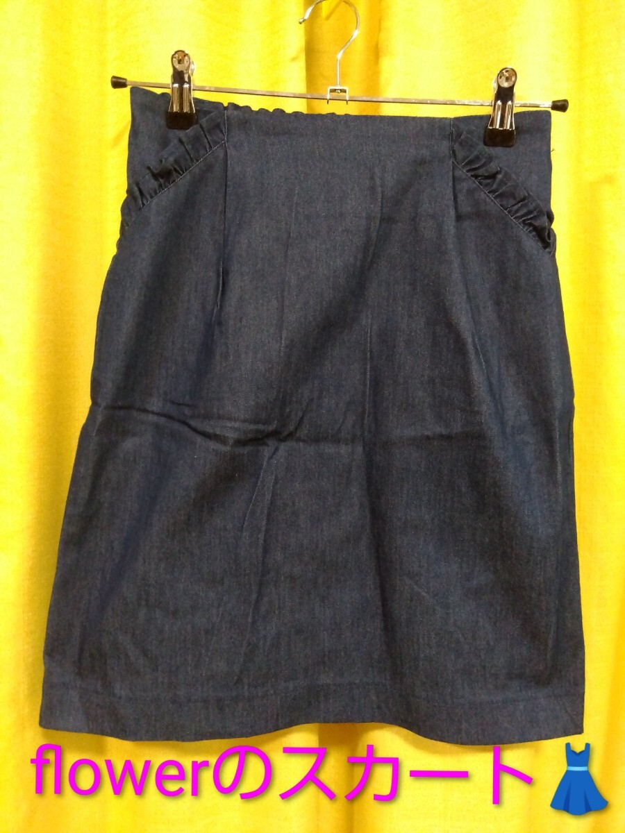 > 【新品・未使用】flower、ひざ丈スカート、台形型、ストレッチデニム素材、ポケット部分のフリルがさり気なく可愛いですファスナー着脱