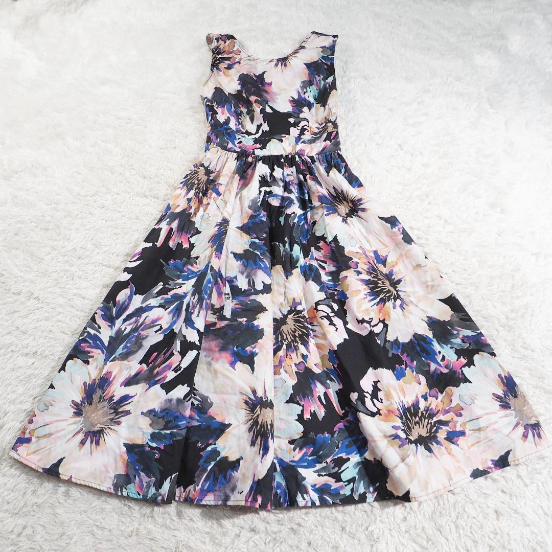 - リエンダ rienda ワンピース コットン100% 花柄染 ノースリーブ フレアスカート ロング Sサイズ