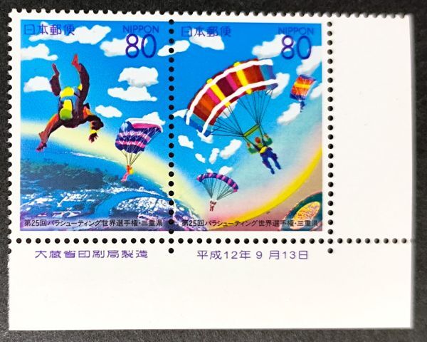 - [25090239] ふるさと切手【三重県・第25回パラシューティング世界選手権】2種連刷 銘版付「フリーフォール・アキュラシー」80円×2 2000年
