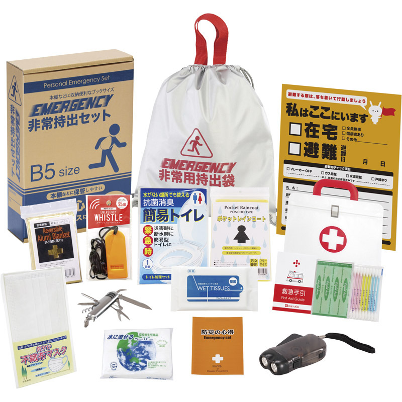〇注意事項・送料800円が販売価格に含まれています・お取り寄せ商品です。弊社にて手配後、メーカー・卸業者からの直送になります。・まれにメーカー欠品、出荷遅延等が発生致します。問題発生時は別途メールにてご連絡致します。・配送方法の指定、日時指定、置き配、ギフト対応、他商品との同梱配送などは対応できません。・まとめ買いや複数購入の場合は通常より発送に時間が掛かる場合がございます・複数個口の場合、2階以上への搬入ができない場合があります。(その場合は1階での受け渡しとなります)・大型連休、お盆、年末年始などは発送をお休みさせていただく場合がございます・メーカー都合により、パッケージは予告なく変更される場合がございます・梱包用のダンボールはリサイクル品を使用させていただきます。・注文に関するご連絡(注文確定通知・発送通知など)はメールでご案内させていただきます※商品ページの内容について、少しでもご不明な点などがございましたら購入前に一度ご連絡ください〇商品説明あらゆるギフトシーンにおすすめです!棚や引き出しに収納しやすいB5ファイルサイズの化粧箱に入った防災セット〇商品仕様●内容:非常持出袋300×340mm、防災の心得、ホイッスル、レインコート、抗菌消臭トイレ、ダイナモLEDライト、アルミブランケット、除菌アルコールウェットティッシュ、マスク、8徳ナイフ、緊急避難カード、水に流せるペーパー、救急4点セット規格●化粧箱入(190×278×60mm) 515g●材質:非常持出袋:ポリエステル●加工地:日本(出典:株式会社 八大)