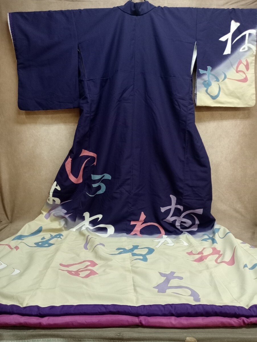 - お引き摺り?レトロ着物 色打掛? 着物 和装 アンティーク風 文字 紫 グラデーション 個性的 お洒落 古着 中古品
