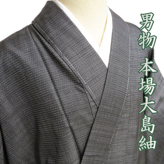 > 男物 着物 未使用 正絹 袷 カジュアル 本場 大島紬 ラベル付き 亀甲絣模様 黒茶色 身丈146cm 裄72.5cm きもの北條 A1266-6