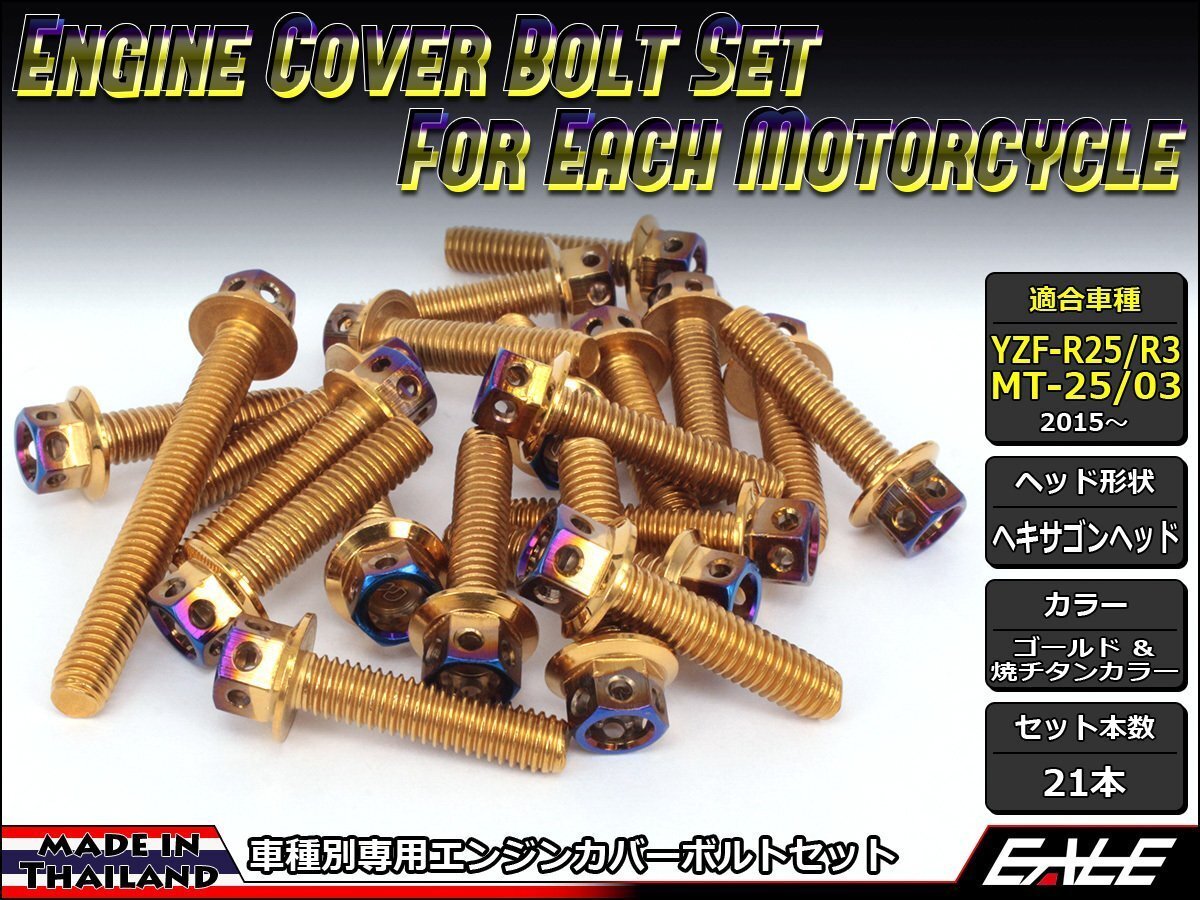 - YZF-R25/R3 MT-25/03 エンジンカバー ボルト21本 ステンレス製フランジ付六角ボルト CTCヘキサゴンヘッド ゴールド&焼チタンカラー TB7035