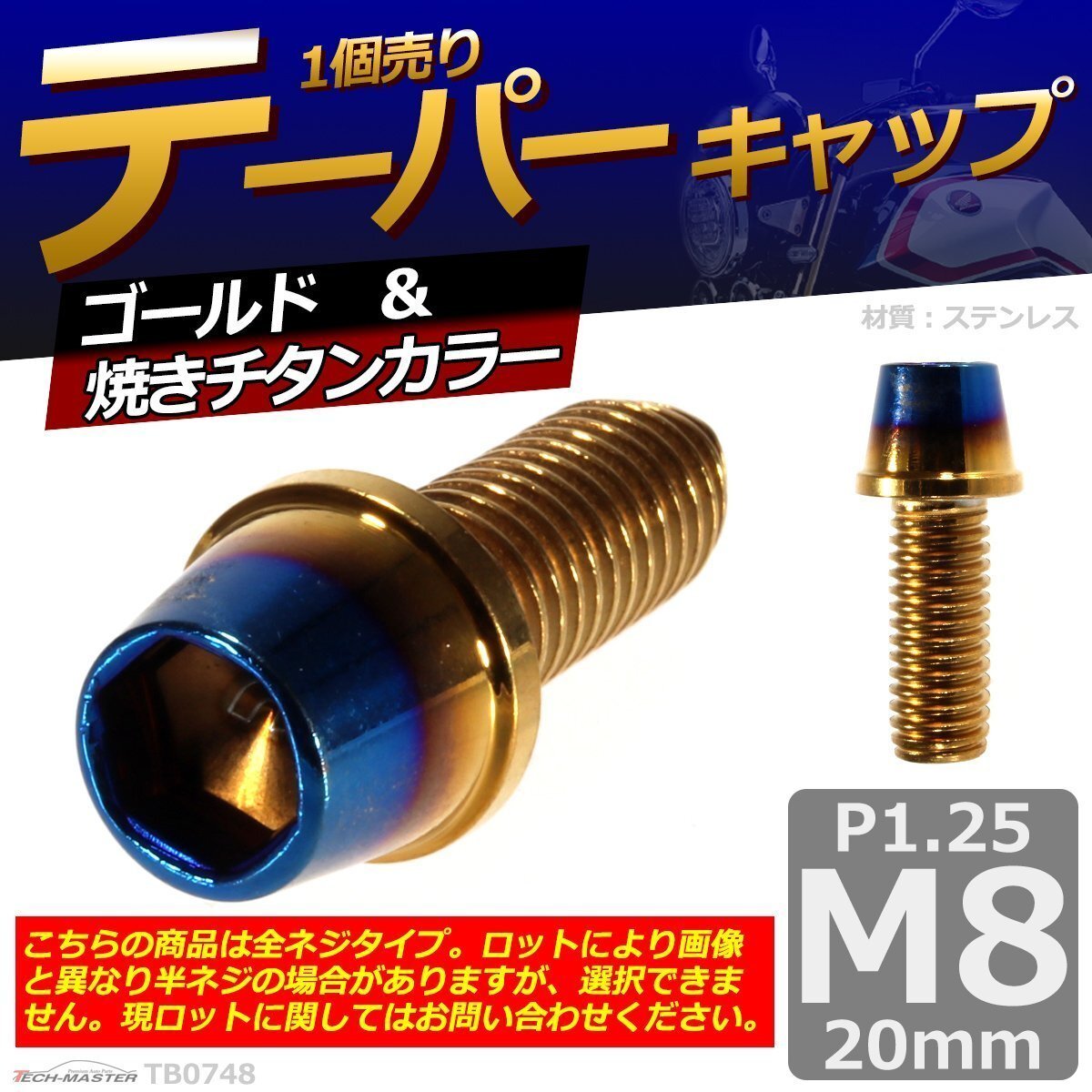 > M8×20mm P1.25 テーパー キャップボルト ステンレス 車/バイク/自転車 ドレスアップ パーツ ゴールド&焼きチタンカラー 1個 TB0748