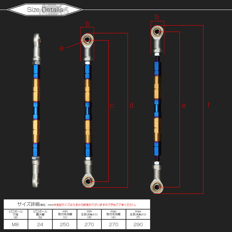 - 汎用 ブレーキ トルクロッド Mサイズ 取付幅250-270mm カラー ゴールド/ブルー 焼きチタン色 タイプA ターンバックル ピロボール TH0065