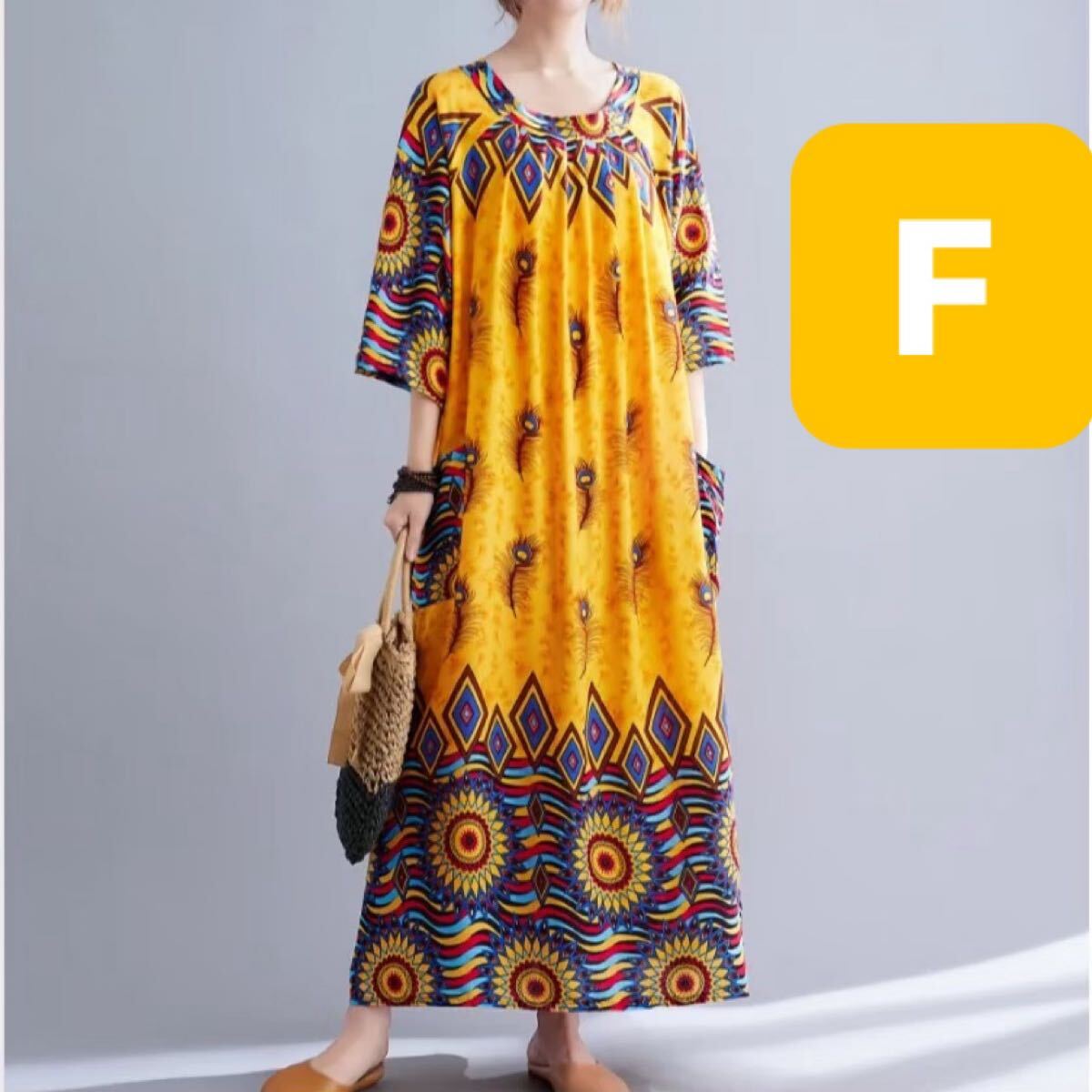 > ワンピース ロングワンピース エスニック ドレス マキシ丈ワンピース モード 体型カバー マタニティ シャツワンピ #黄色 #イエロー #F