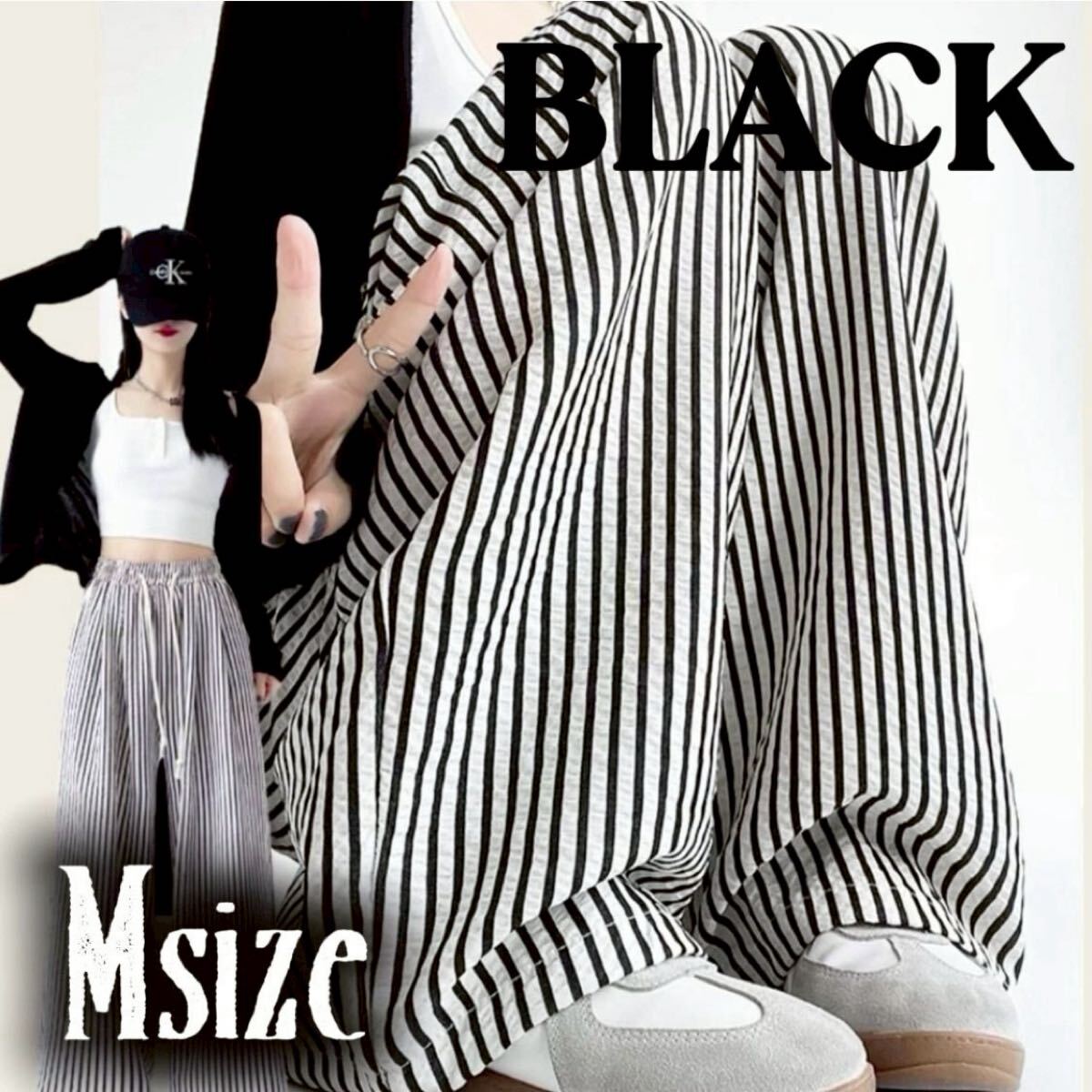 - 体型カバー ストライプ ワイドパンツ レディース 薄手 楽ちん 韓国 黒 M