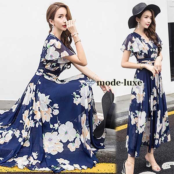 - 未使用 発表会 舞台衣装 パーティ フォ-マル 花柄 シフォン ロング ドレス 9号 M (OPN3132)