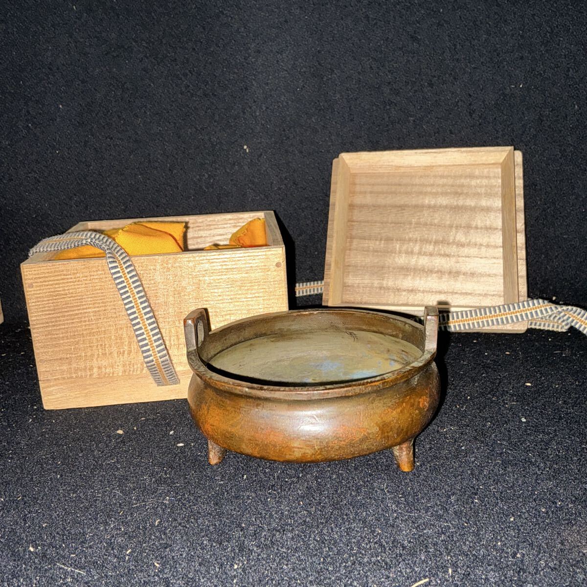 - 古銅製 銅器 香爐 香炉 耳付三つ足香炉 双耳香炉 送料一律600円 香道具 木箱入