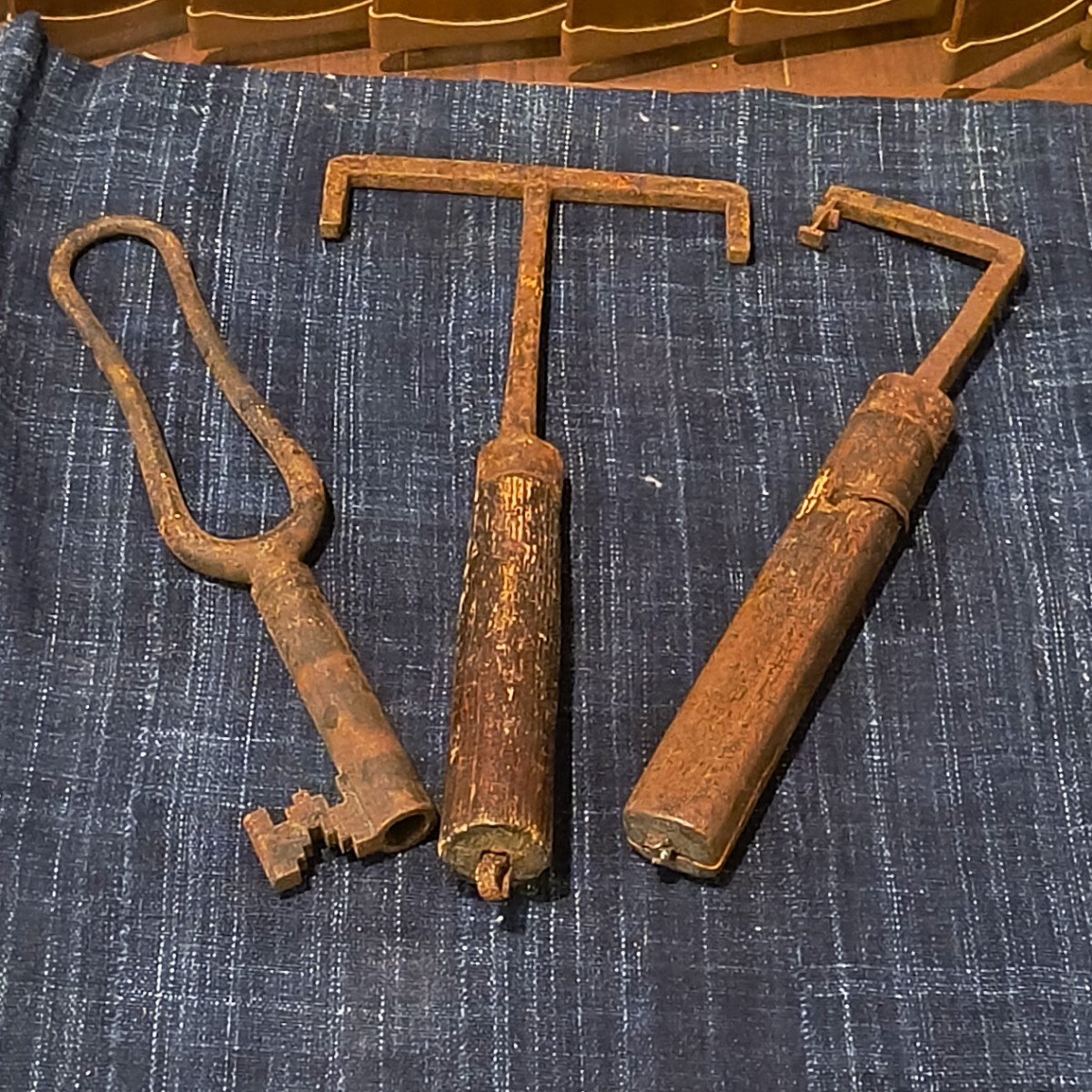 - 未整備 古鉄 蔵の鍵 3ヶ 江戸 明治 検) 古道具 骨董 古民具 和鍵 錠前 シャビー オブジェ アンティーク 落とし鍵 T字 L字 時代物 古鍵