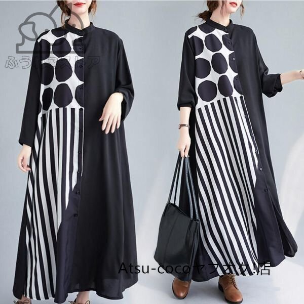 - カジュアル プリント柄切り替え 体型カバー 大きいサイズ おしゃれ 長袖 レディースシャツロング丈ワンピース