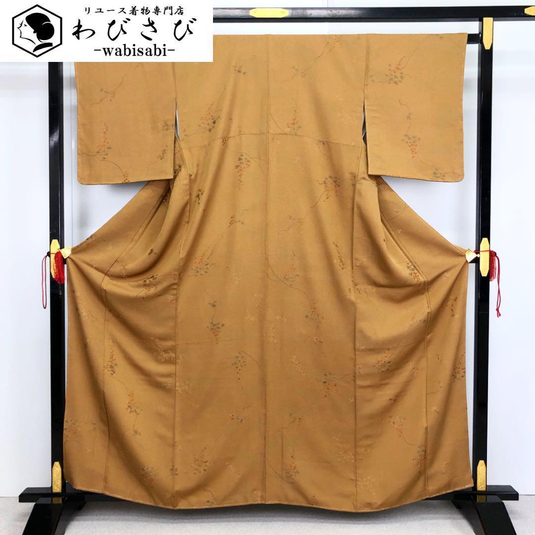 - 小紋 蔦の葉と実 黄茶色 しつけ糸 K-2578 着物 きもの kimono 和服 和装 中古 リサイクル着物 【送料無料】