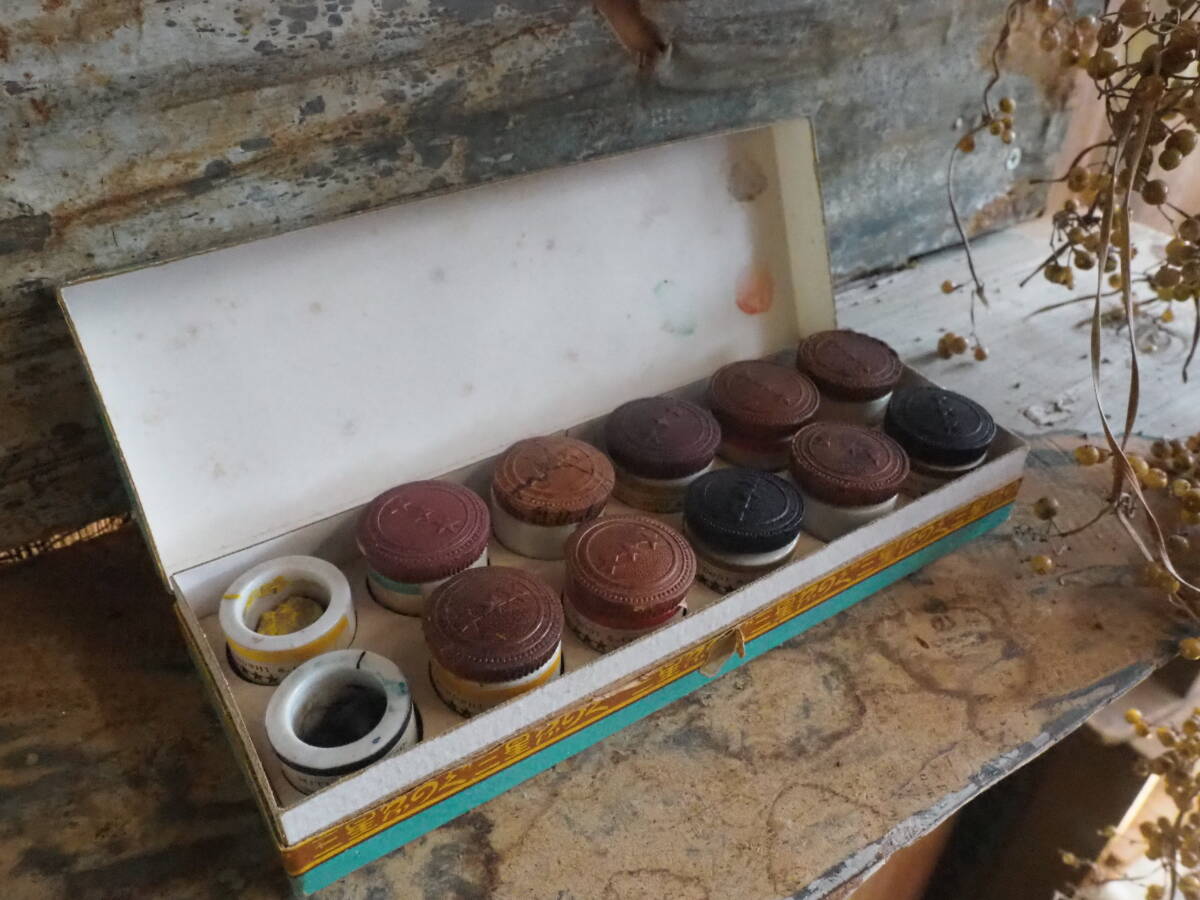 - 【陶製容器入り12色水彩絵の具セット】デッサン古道具アンティーク骨董インテリア文具インダストリアル文房具油彩水彩キャンバス額縁
