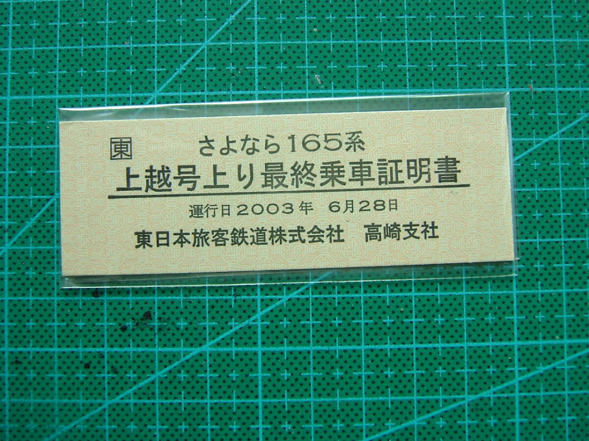 - JR東日本 さよなら165系 上越号上り最終乗車証明書 D型券
