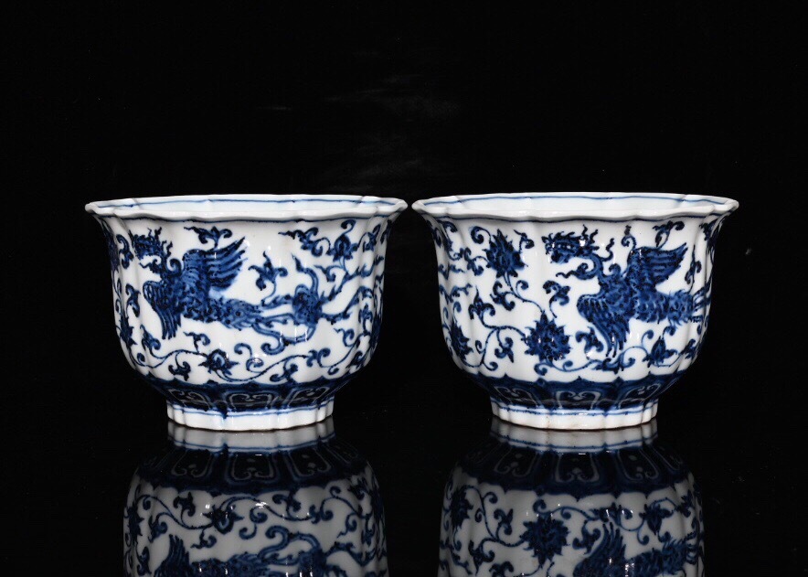> 『館蔵珍品 明 宣德年製款 古陶瓷品 青花 纏枝蓮鳳紋 供碗一對 陶藝』稀少珍蔵品 古賞物 貴重物品 収蔵品 中国古美術 時代物 古董品