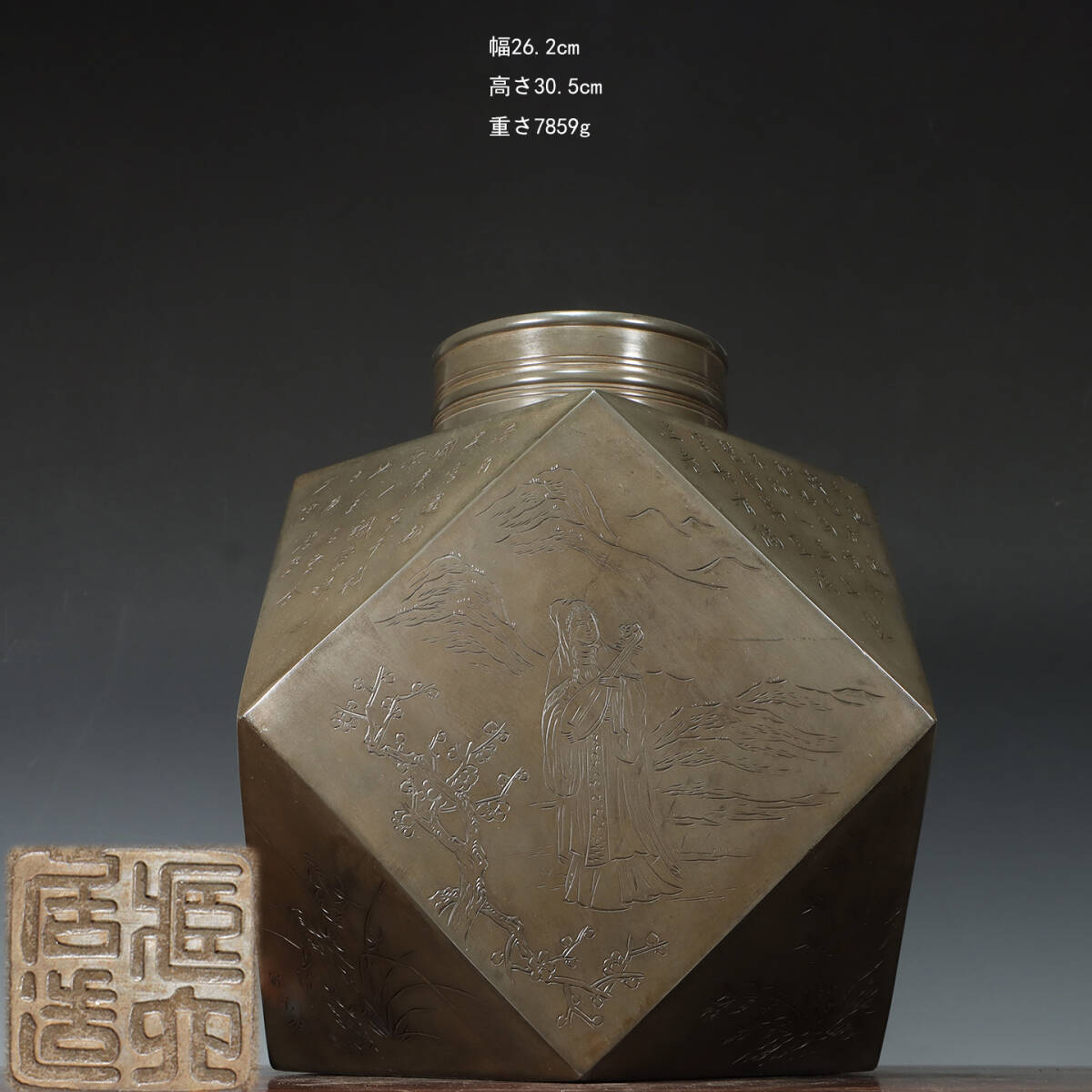 - 古錫 茶葉罐 蔵六居造 「錫刻四大美女題詩文大茶心壺」 茶筒 茶入 茶壷 茶道具 錫肌 茶器 時代物 重さ7859g LT-250902