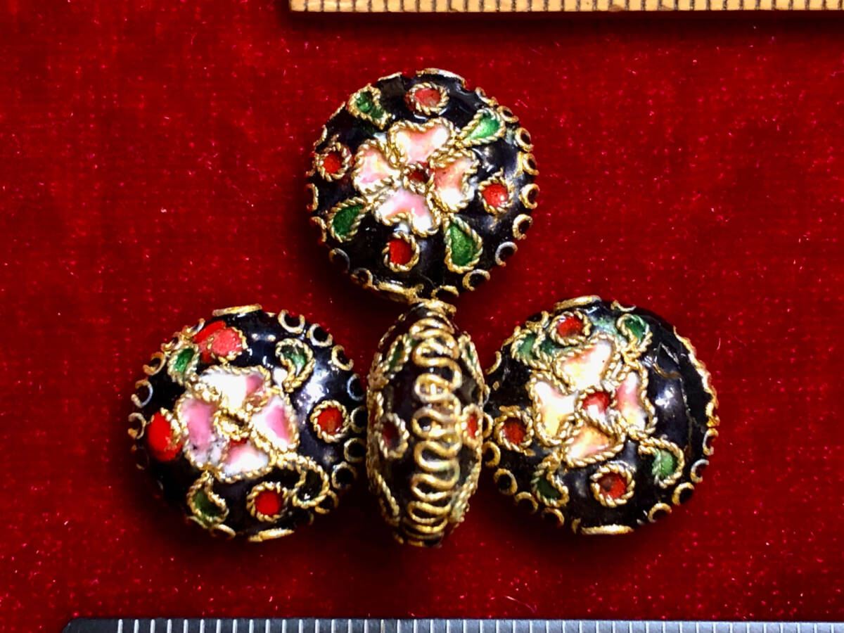 - ¶!¶ 有線七宝焼ワールド - 4個の円盤型玉で1単位 ¶!¶ 約6㎜×14㎜円盤型玉 金線に黒釉ピンク星花 手作り 手芸 工芸 インテリア 趣味