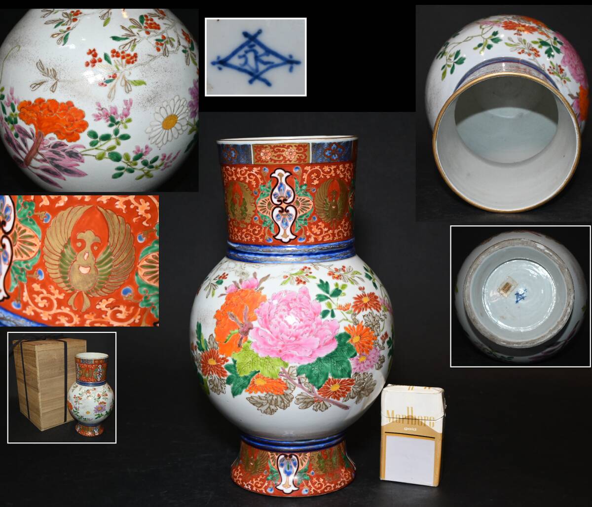 - 姫路藩窯 東山焼 永世舎 明治期 色絵金彩牡丹菊花文花瓶 高約32cm 幻のやきもの 兵庫県姫路市 合せ箱 真作 花図 花生 花器 飾壷 古美術